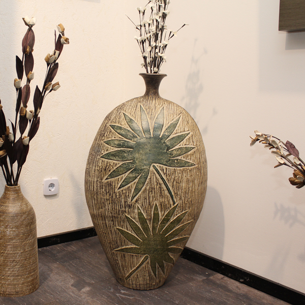Keramik-Bodenvase mit extra schlankem Hals und Blattmotiv.